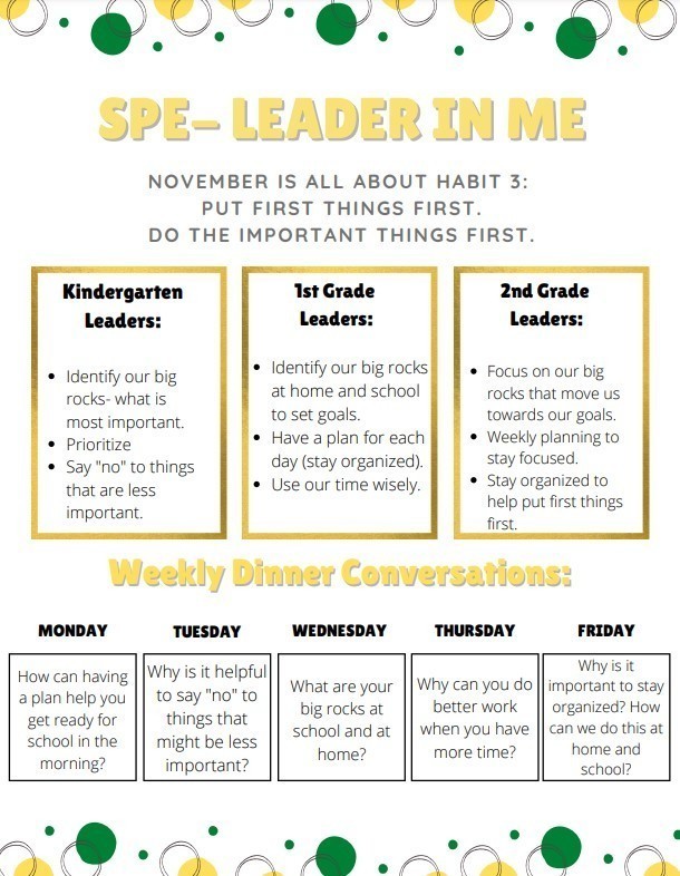 Put First Things First: I spend my time on things that are most important. This means I say no to things I know I should not do. I set priorities, make a schedule, and follow my plan. I am disciplined and organized.
