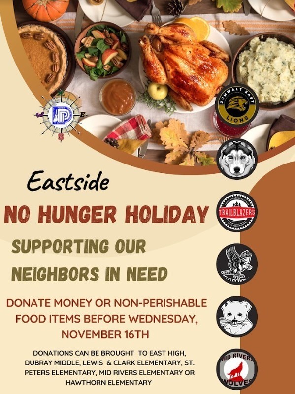 Our annual No Hunger Holiday Turkey Drive is fast approaching. Last year, 1,500 Fort Zumwalt families were served through our donations. The Eastside is once again teaming up to donate as much as we can. The Turkey Drop Off will be Wednesday, November 16th. Please bring your turkeys to East High, DuBray Middle, Lewis & Clark Elementary, St. Peters Elementary, Mid Rivers Elementary, or Hawthorn Elementary before 9:00 AM. If you would like to donate money towards a turkey or other non-perishable items please bring those to your respective school before November 16th.